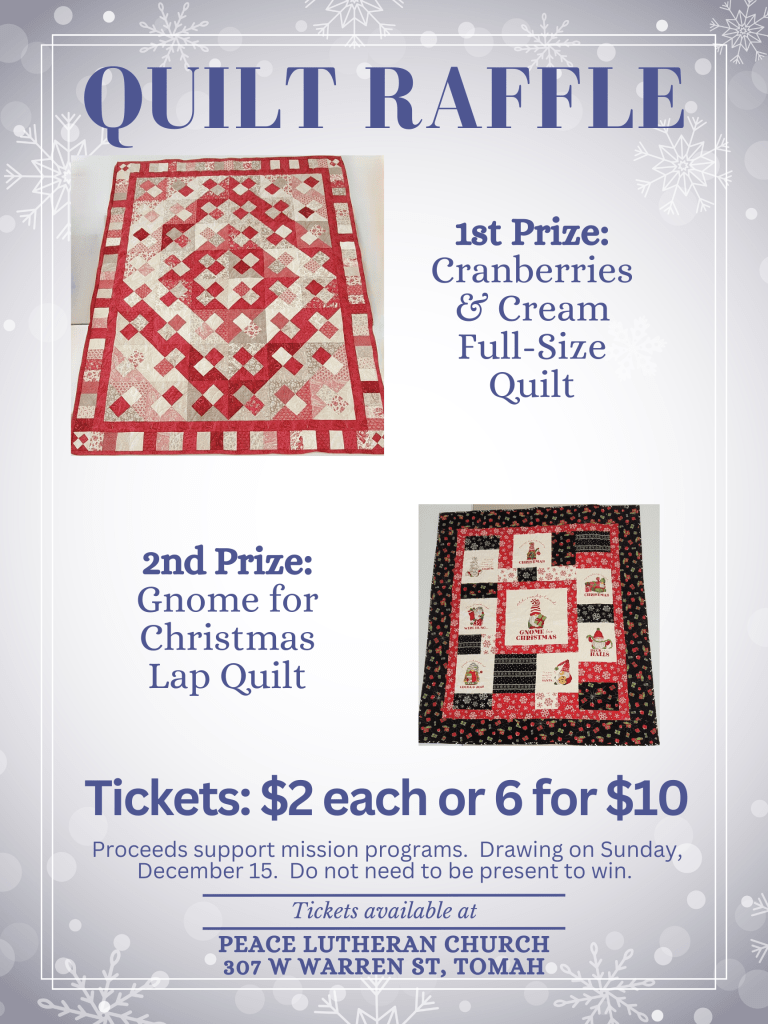Just as the motto of Peace Lutheran goes, “All are Welcome” with the group. Whether you sew/quilt, knit, crochet, cross-stitch, or just want the fellowship of others – come!
